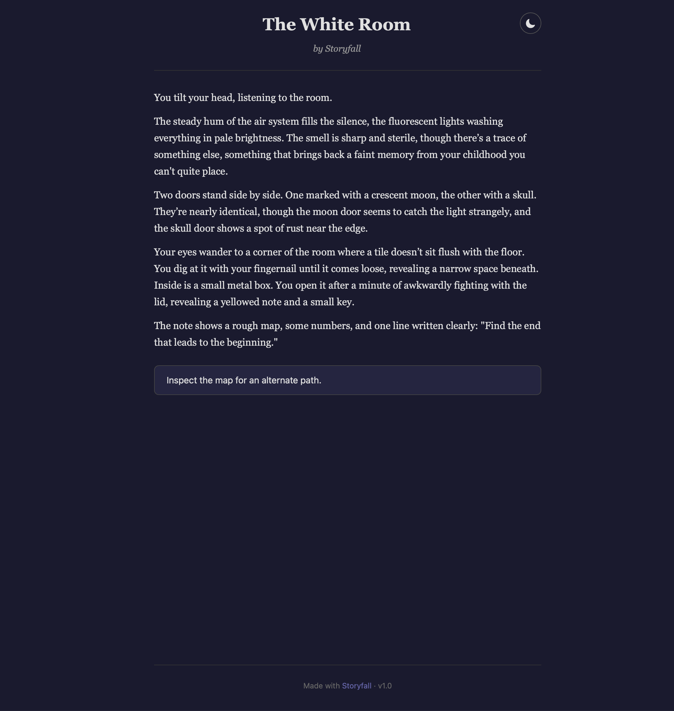 The other thing I added is the ability to export games as HTML. I already had a JSON export system but all that was useful for was backing up and re-importing your story into Storyfall. The HTML export produces a standalone file that’s playable offline or can be hosted on a web page. This is also a WIP and isn’t 100% up to feature parity with the storyfall.com player, but it does most things, including variable substitutions and choice effects (e.g. you choose something and it increments some variable).