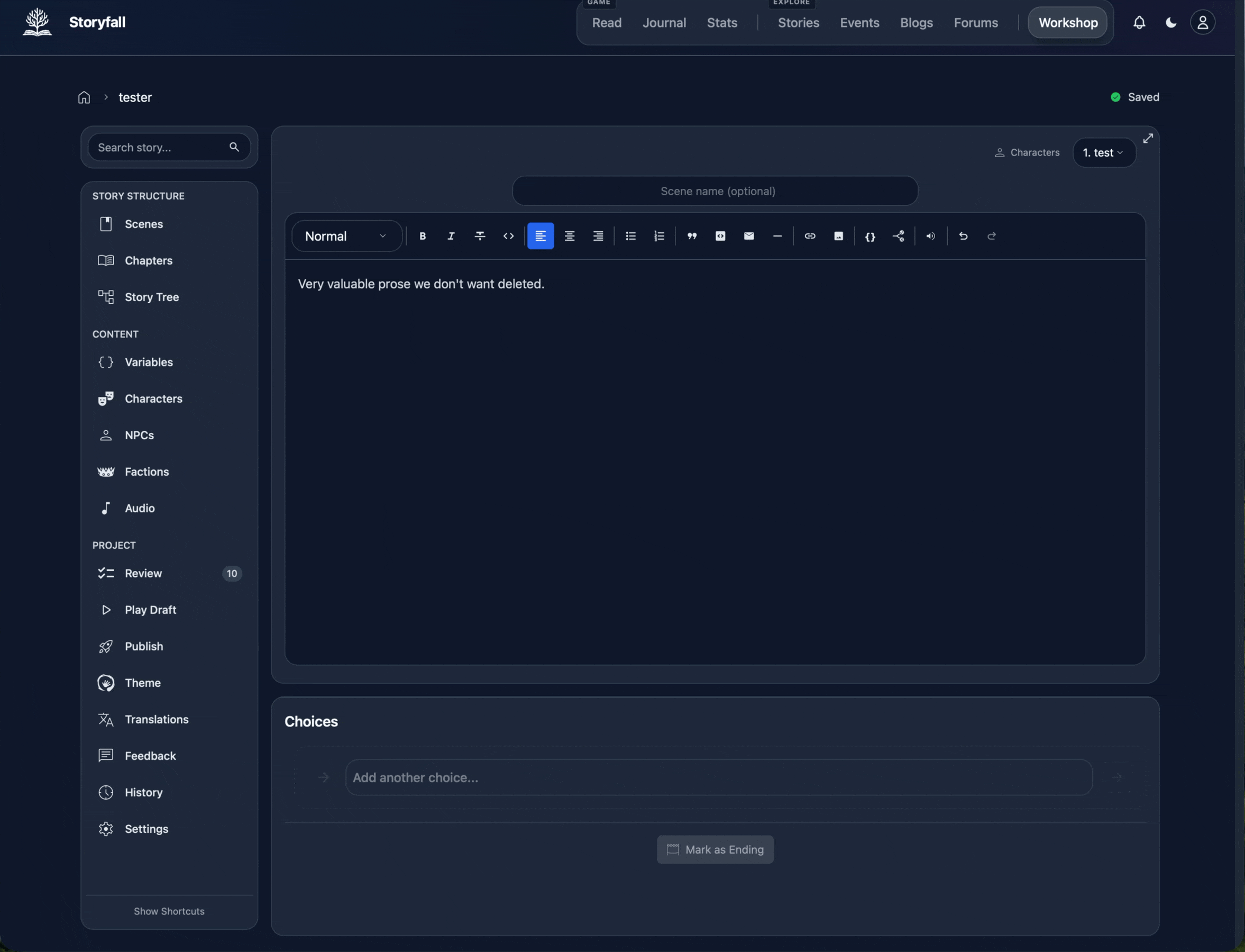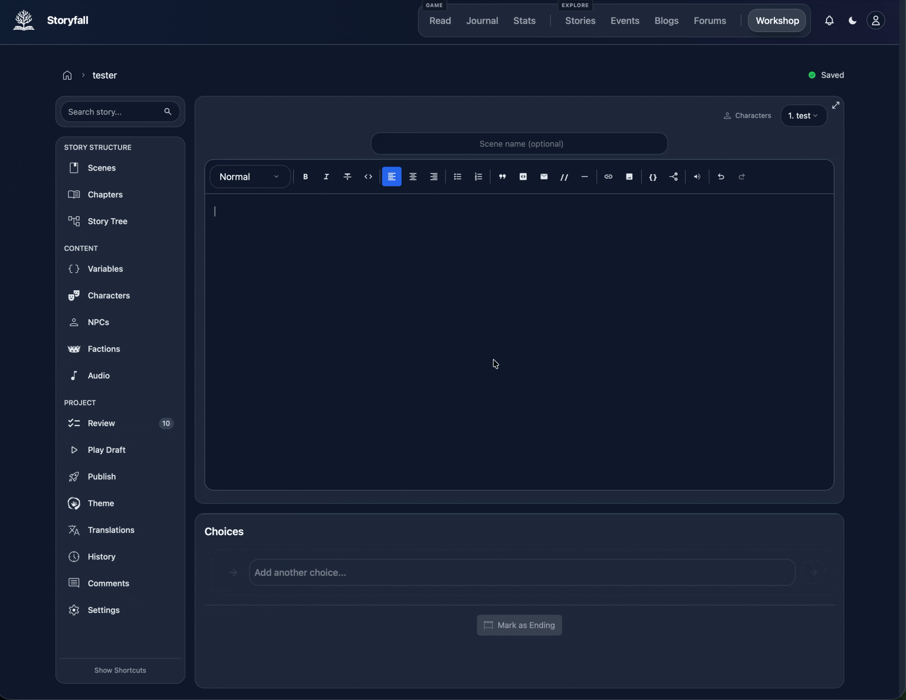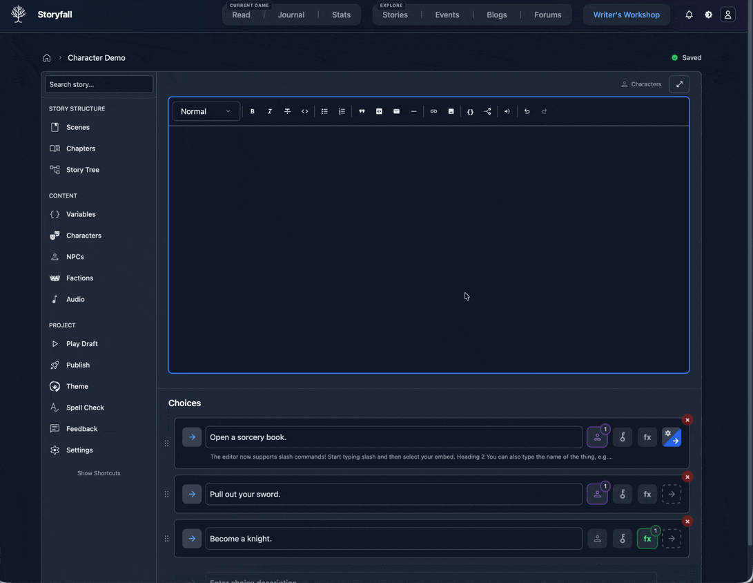 You don’t even need to register to play around with this feature. Not everything maps perfectly of course, for instance Twine hyperlinks end up being choices at the bottom of the scene - and custom macros and JS are skipped entirely, but this is a good start I think. It would at least make it significantly easier to re-host a Twine or Ink story on Storyfall, fix up a few things, and, for instance, enable multiplayer gaming for free!