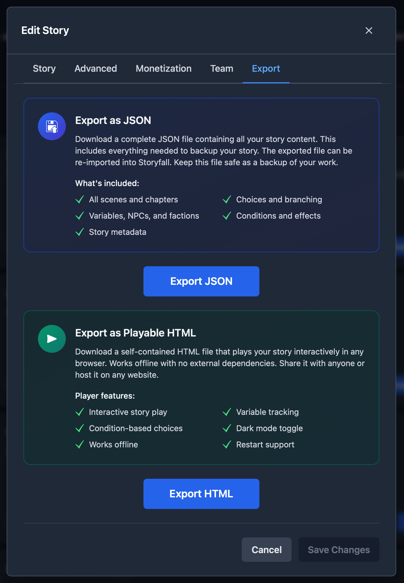 Hopefully this alleviates some concerns folks had about “what happens if Storyfall implodes one day” - and it should make it easier to move your work both in and out of Storyfall. I don’t like walled gardens and prefer to give writers the ability to go somewhere else if they want.
