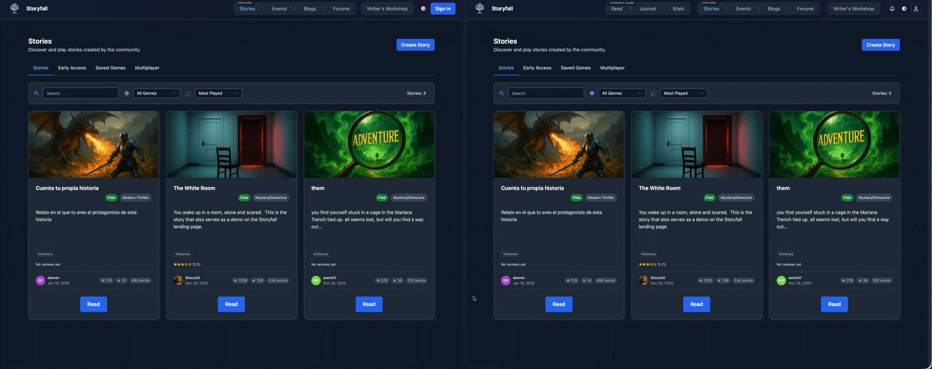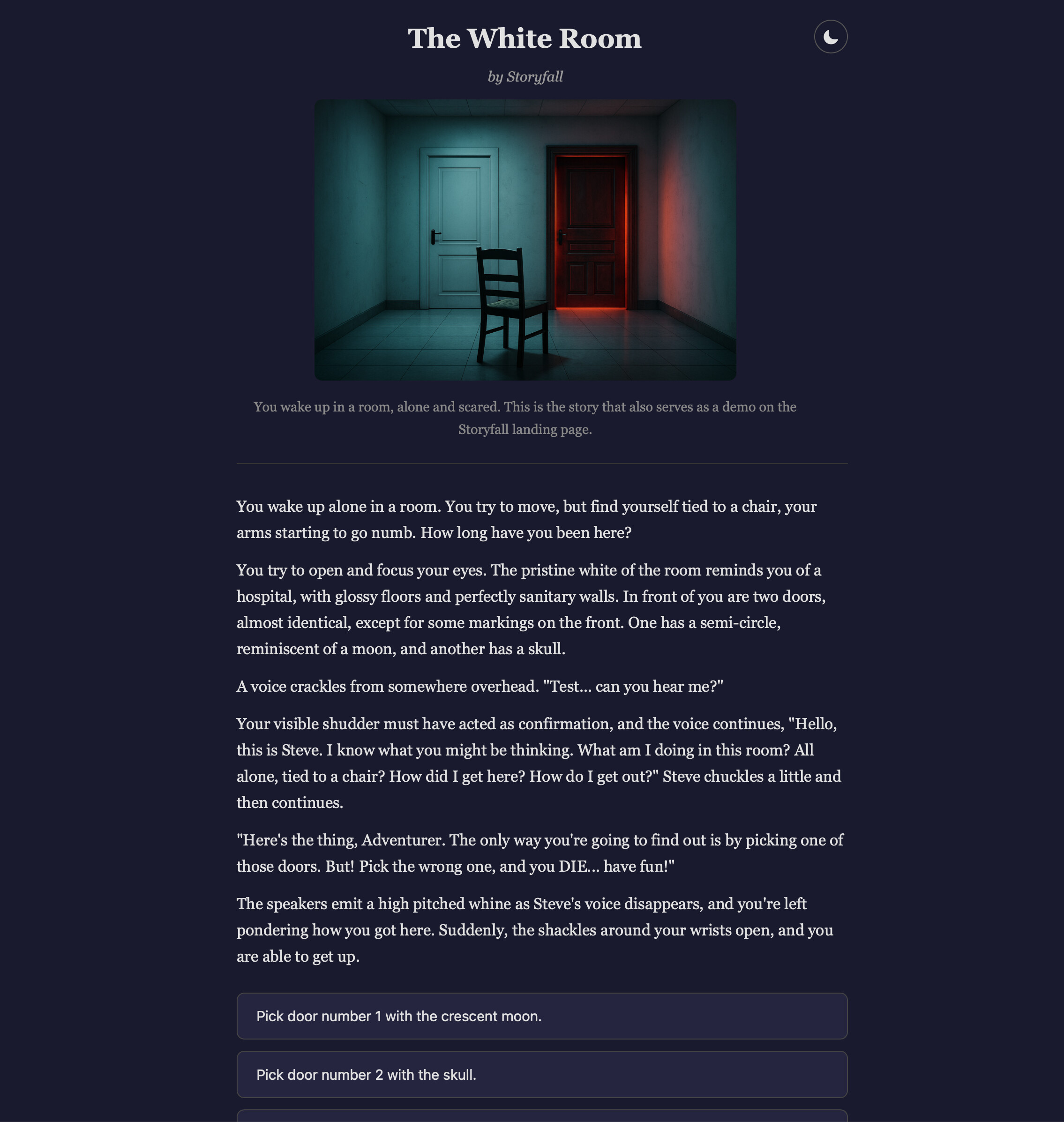 I added my first iteration of voting-based multiplayer games! I’m really excited about this. It makes ANY story on Storyfall multiplayer-capable, without requiring any additional work from the writer. You can just go and create a multiplayer game from any published story, share the invite code or link, and your friends can join and play it with you! You can set whether voting is by majority or unanimous consent, and also add a voting timeout. I even added a chat!
