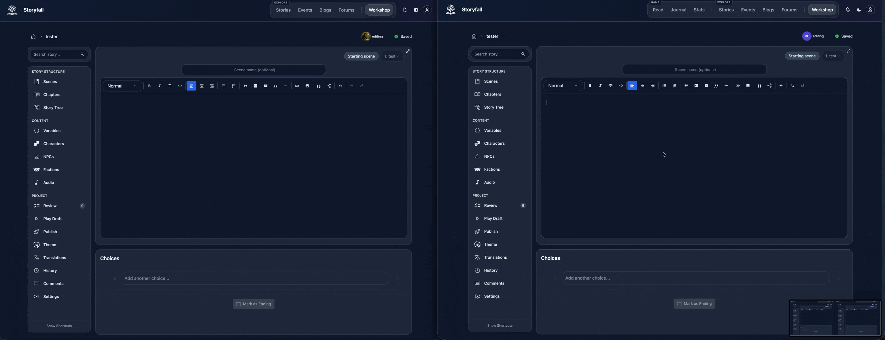 This was kind of a fun stretch goal I had for the editor - there’s probably not a ton of people looking to collaborate in real-time on interactive fiction, but I like synchronized functionality like this and I was able to re-use some of the code from the multiplayer modes. I’m curious if anyone ends up using this for any collaborative stories - let me know if you do!