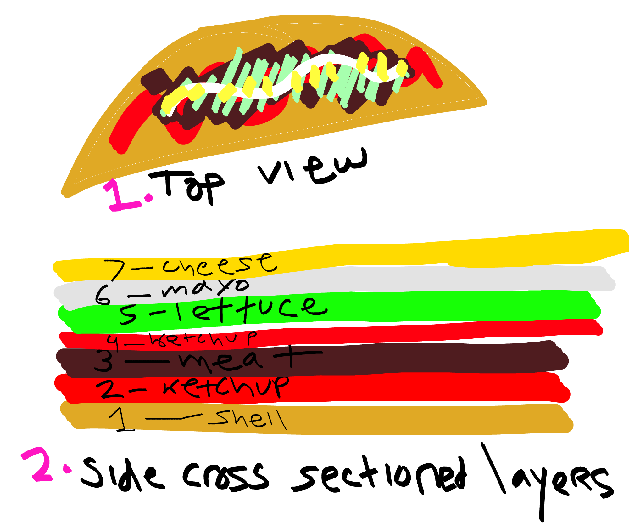 Yeah. My brother is indifferent to any structuring of his, (half the time he’s just spooning ketchup mixed with ground beef into his mouth while eating the broken up shells) but I can’t and refuse to eat them if I don’t put everything in that exact order. (The layers doesn’t show the like, quantity of each item, just where they go in the stack.)