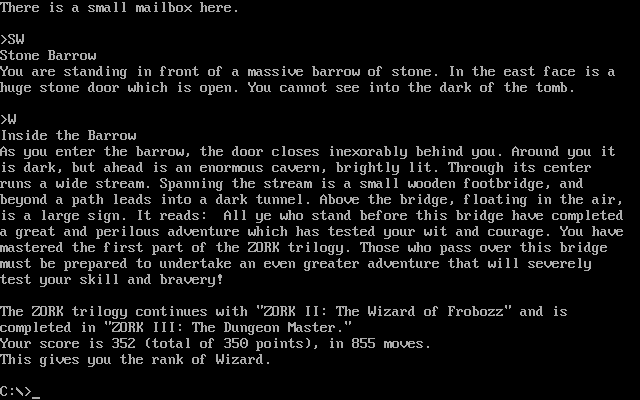 The “endgame” triggers when your score reaches exactly 350. (I guess that means you can’t win if you’ve died before reaching this point?) By the end of the game, I had 352 points but no map to the barrow. And I don’t think there are any treasures other than the glowing sword that are worth exactly two points. So I had to take the sword out of the trophy case, and at this point I no longer had the troll, the thief, the spirits or the cyclops to make the sword glow. But the bat is still there.