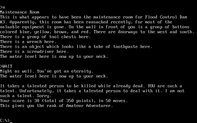 By the way, I think there may be a bug here? In Mainframe Zork, you don’t drown until the water is “high in your lungs”.