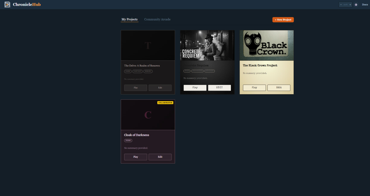 One feature request while this is in active development: I’ve been enjoying the recent lets-plays of StoryNexus games (1, 2), but it sounds like the players are going to great pains with third-party tools to get usable transcripts to share. Could ChronicleHub have a transcripting feature built-in, that would let you view (and copy as plain text or Markdown) everything you’ve done in the current session?