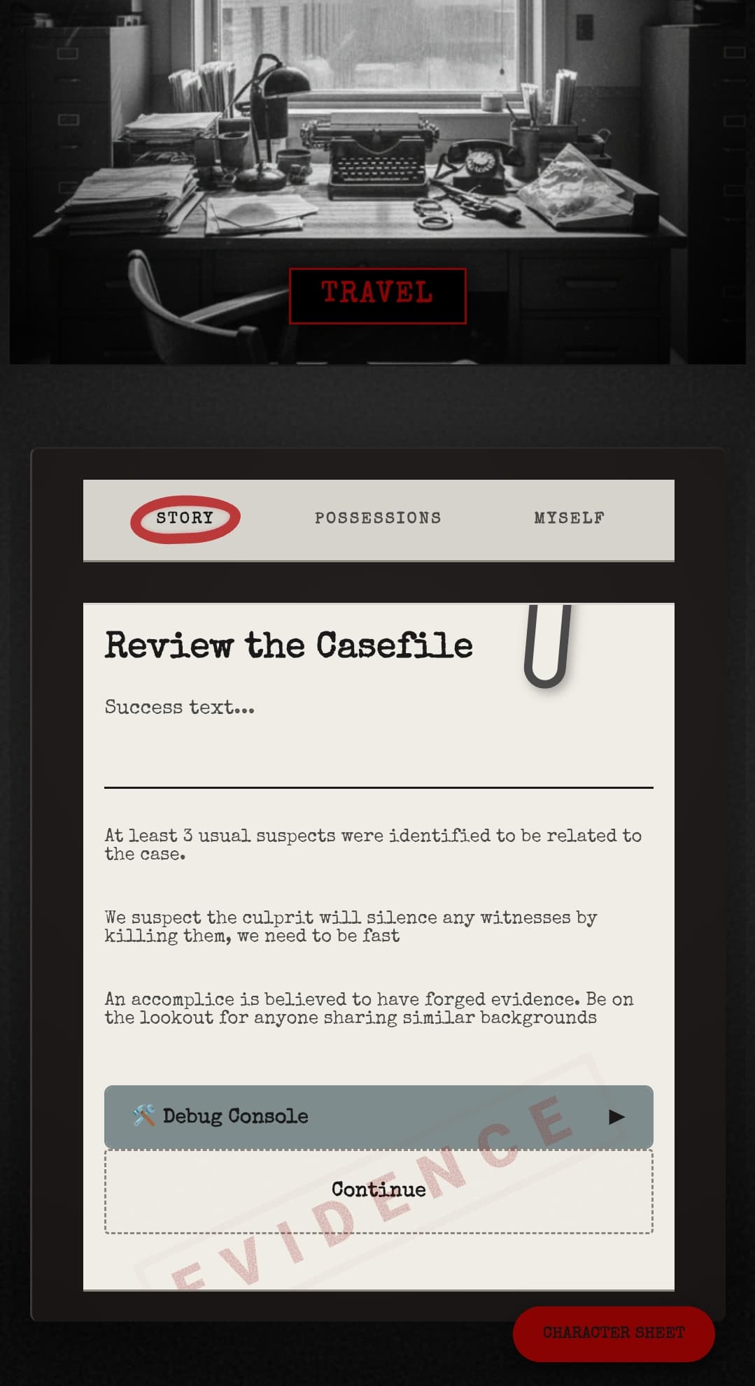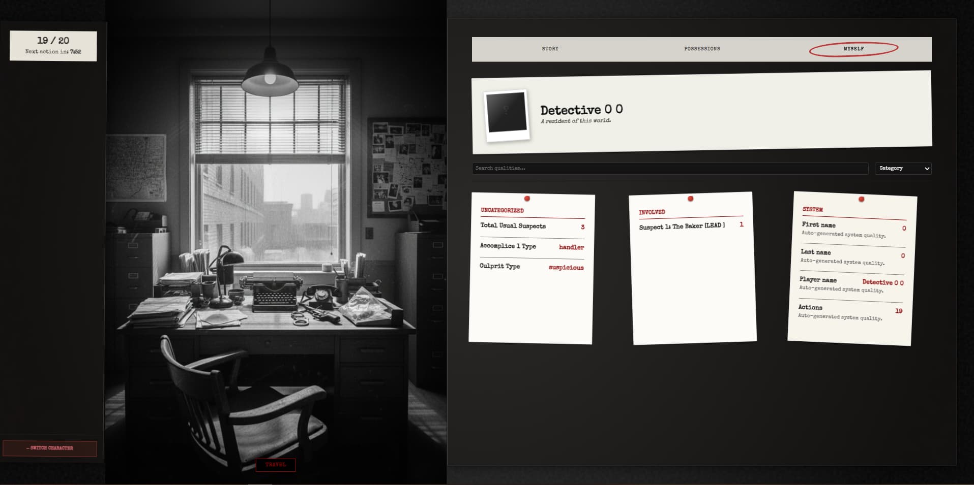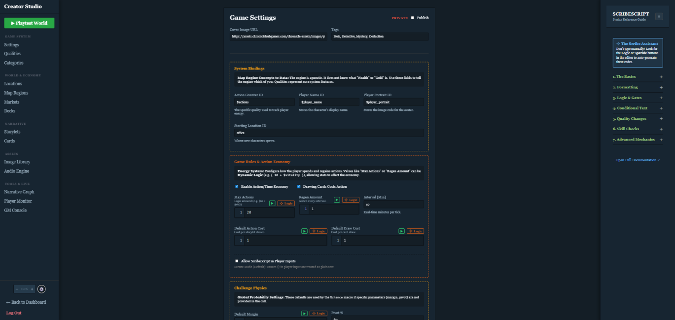 I just did a major refactor of the front-end, to make sure it now actually displays correctly on mobile phone. Since ScribeScript is now increasingly becoming complex and even I am running into with issues by stretching the capabilities of the parser, I made sure to add a stack/result trace to any ScribeScript enabled field. I did a lot of updating. Just to test my own engine, I am making sure to build a game of my own to really stress test what it can do, and otherwise make sure the engine is updated to support any ideas I might have.