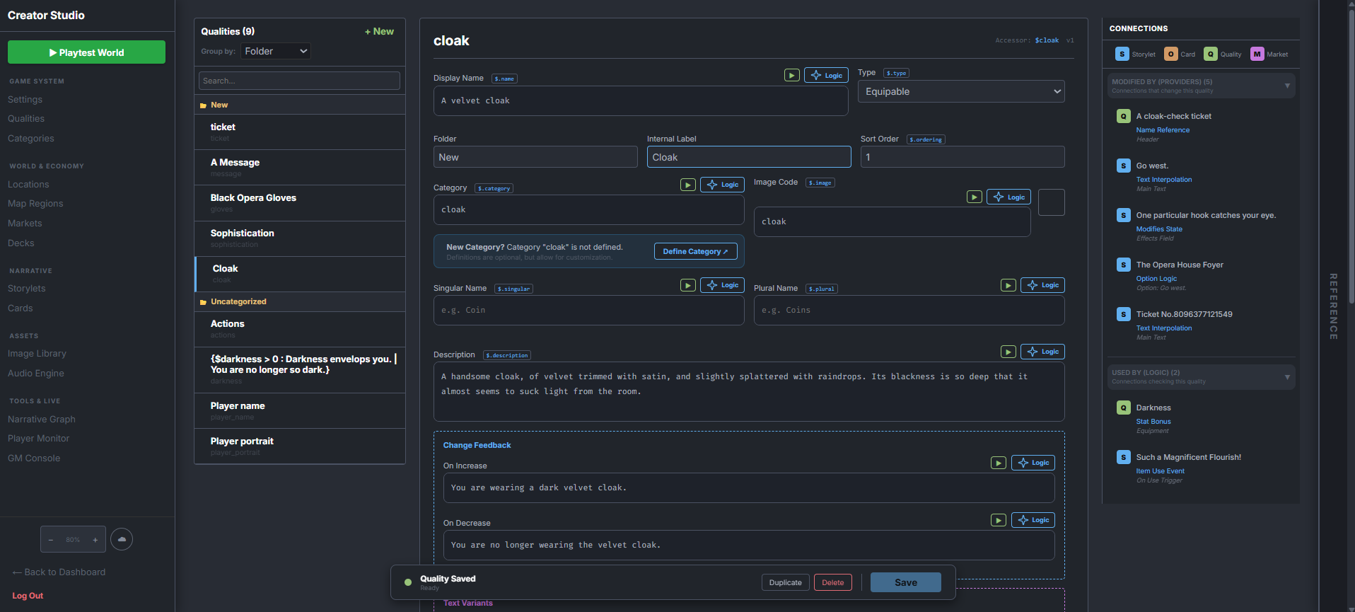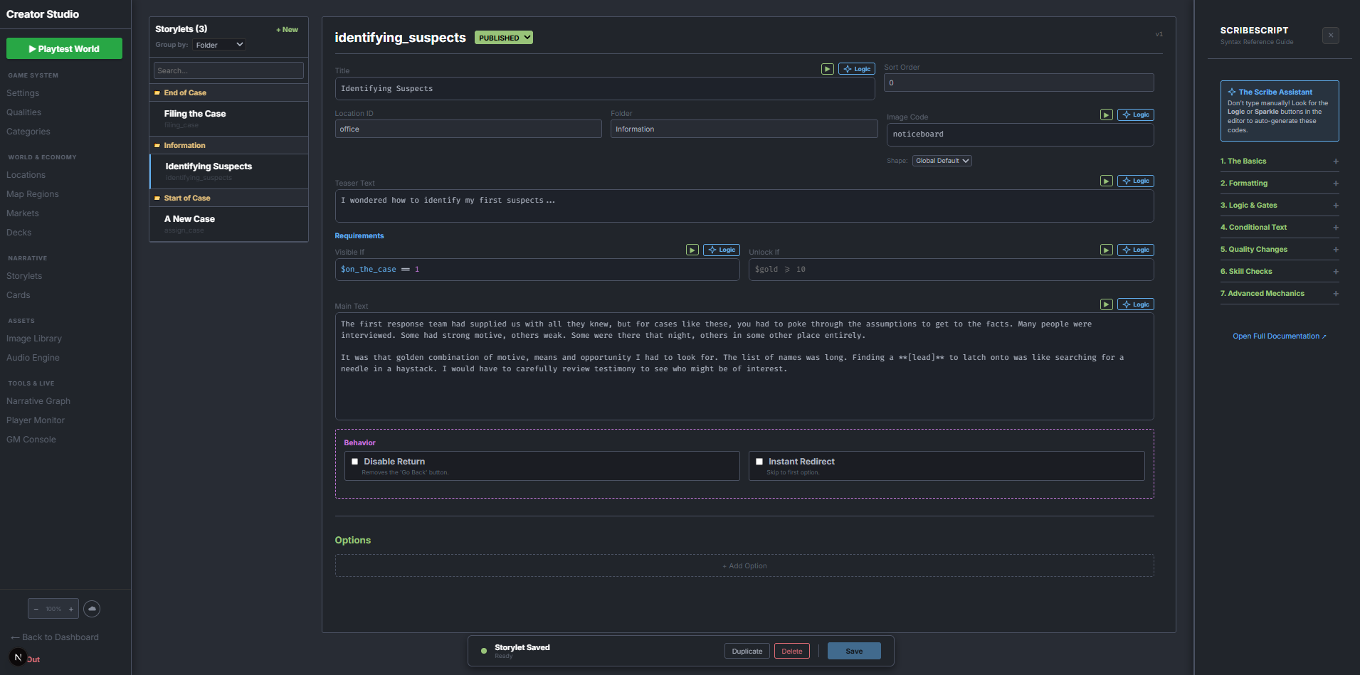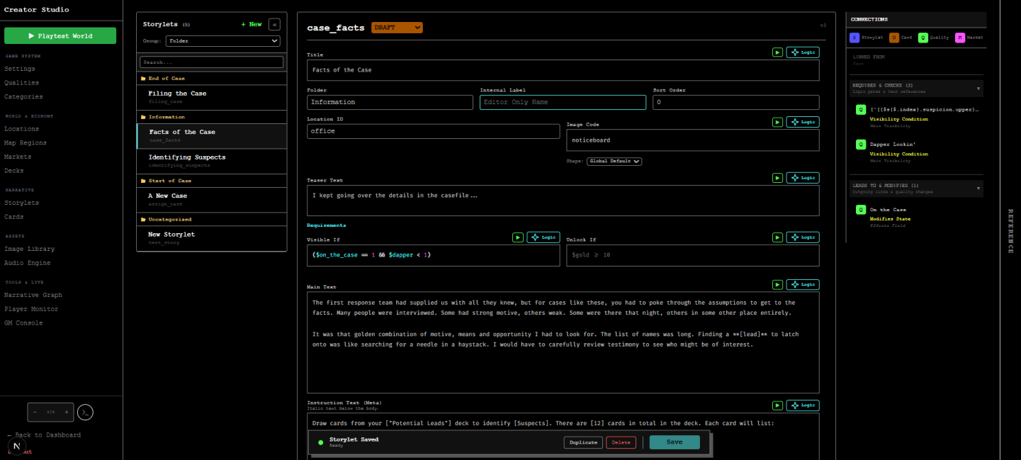 As I already confided in @HanonO, the fact that so many people are launching Interactive Fiction platforms does cause some lingering insecurity. As such, I am very happy about everyone who continues to voice their desires and critical questions. The new editor tools are definitely a result from that constant dialogue with people who are testing the platform (and me also trying to actively use it)