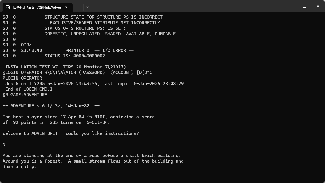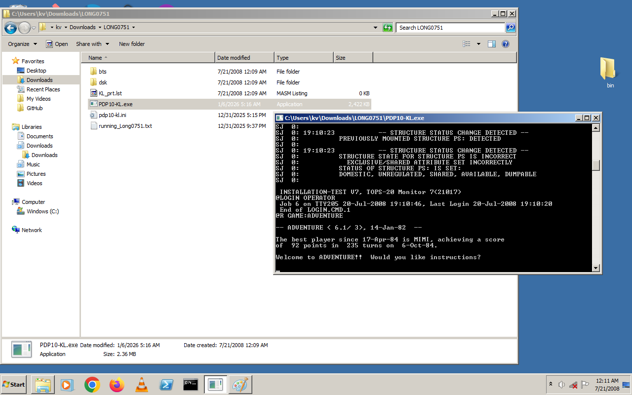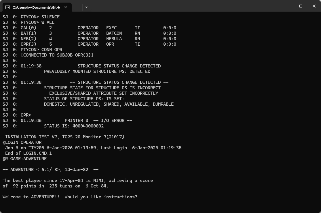 That build didn’t work (as noted in the Advent TXT file, as it was the Release build), but at this point all the VS2008 stuff had been updated to work with VS2019. I then opened “sims/Visual Studio Projects/Simh.sln” in Visual Studio 2019, which has the Debug build by default when opened, and built the project. It showed an error at the very end, but that was after it successfully created “sims\BIN\NT\Win32-Debug\PDP10-KL.exe“. I just dropped that EXE file in the unzipped “LONG0751” folder, and double-clicking the EXE loads it up, whether on Windows 11 or Windows 7.