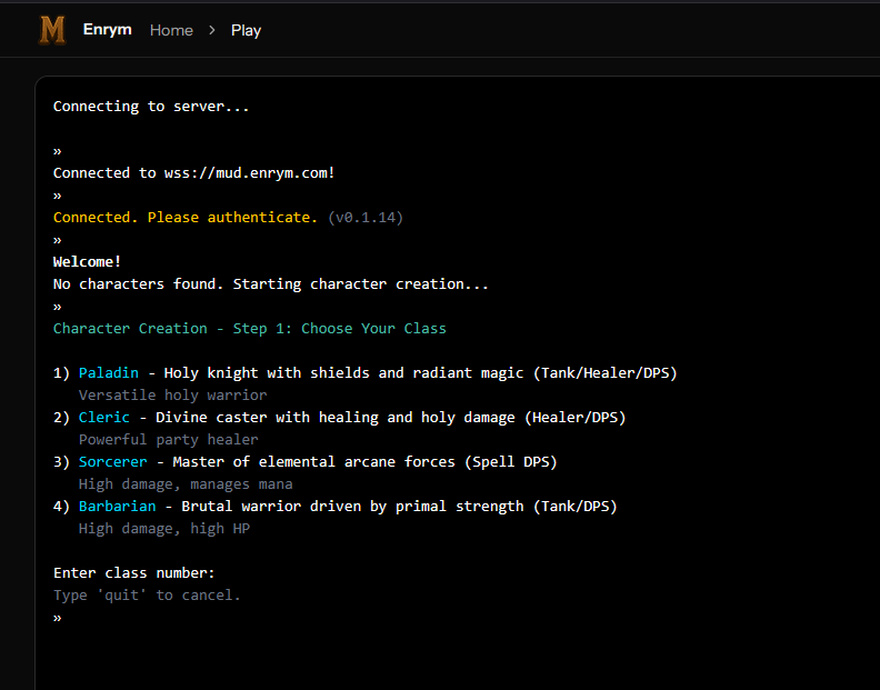 So, I get that. This is alpha, I have been pouring hundreds of hours into this and had to draw the line somewhere. I’ve drawn the line here and calling this Act 1, Alpha complete. One of my possible beta plans is to include a telnet capability. I have not figured out the full plan there for how to secure the player’s account, it may just be a less secure account and once you have a regular web account, then your characters would only be accessible through the web account, but if you only create a character through telnet, and set a password there, then you could continue to access it through telnet. That might be a reasonable compromise to bring in the folks that want to use those types of clients.
