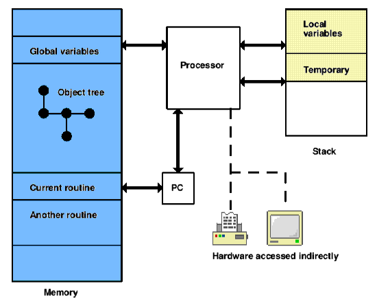 In a Quetzal file, there is the IFhd chunk which contains the stored program counter, but I don’t understand where it’s supposed to point. I think it has something to do with the return value from the @save instruction. Following that is the CMem or UMem chunk (compressed or uncompressed). After making Frotz make a UMem chunk, I figured out that this contains the dynamic memory of the Z-machine. Then comes the stack chunk: Stks. I don’t understand this one at all. Why does it need to exist if stack data lives in dynamic memory?