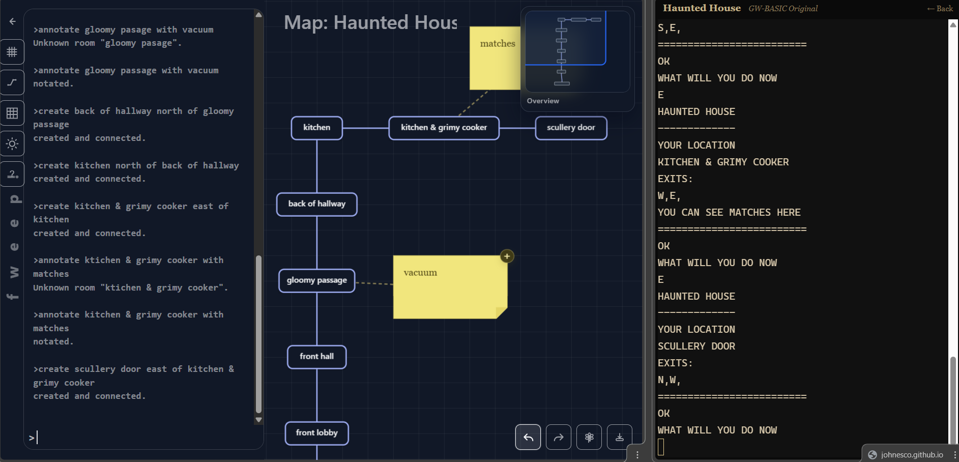 (This was an unfortunate choice of test game. Several room names being similar to each meant the keyword matching usually didn’t work, and I had to type out the entire long names in quotes, which is more tedious than connecting rooms visually)