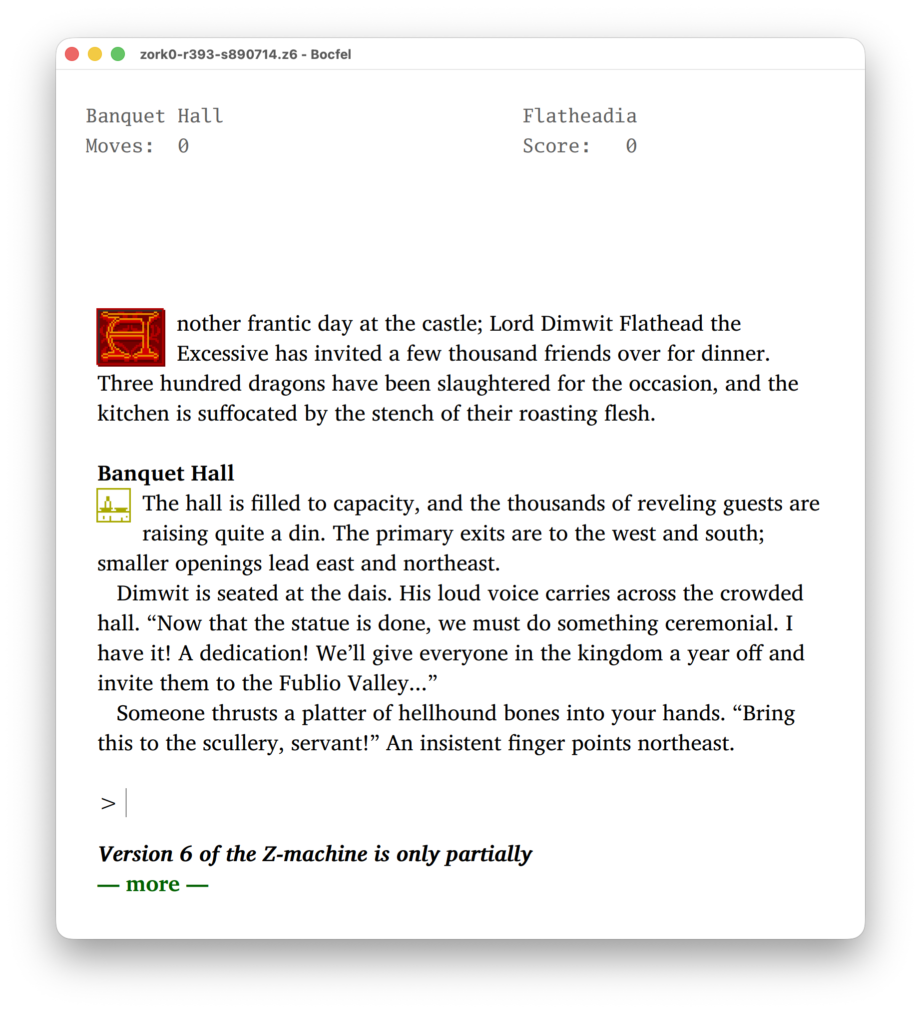 I missed this post from last week. As always when it comes to Infocom V6 games, there’s a lot that needs to be clarified when we talk about “supporting” those games, but, as far as I can tell, graphics don’t work at all on my machine; it’s a significant regression from the previous version.