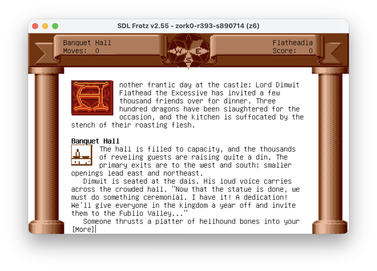 The issue is that, on resize, the graphics windows that handle the pillars and banner are cleared, and it looks like there’s an immediate resize event occurring on startup. Zork Zero knows which pillars to draw at any point in time, but Bocfel doesn’t.