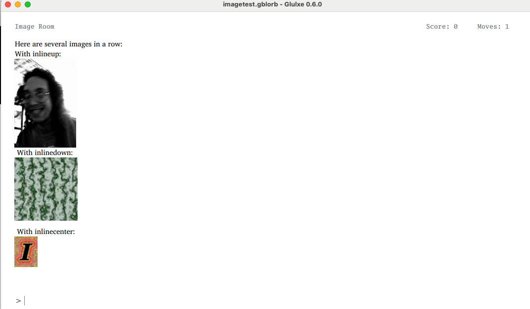 Right now, I’m deep diving into Glulx’s support for graphics, and I noticed some rendering in Gargoyle which doesn’t look quite right. I think the inline image options aren’t working for me. Here’s the how the imagetest.gblorb test app from @zarf’s site renders on my Mac using Gargoyle: