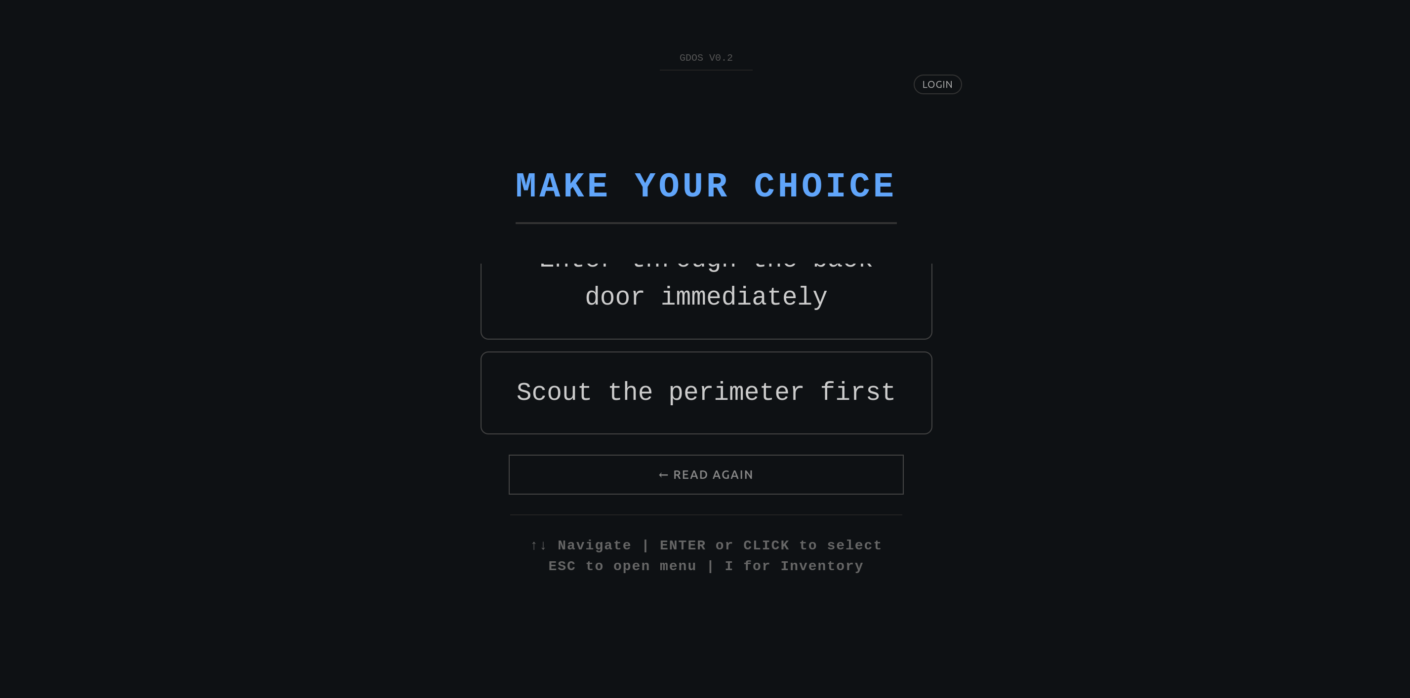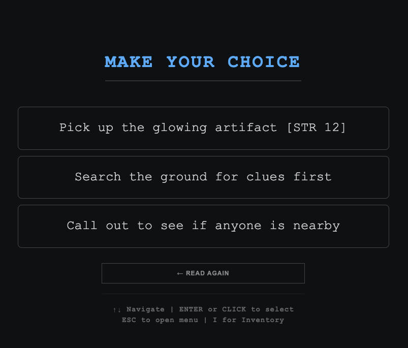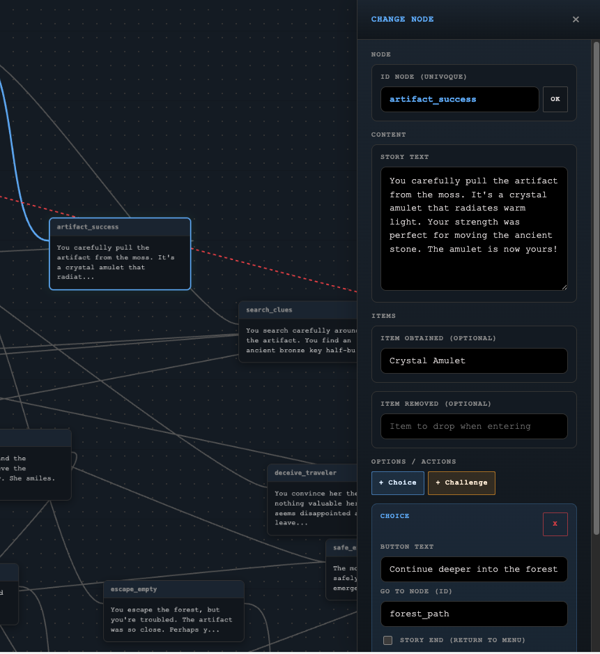 The main difference from other engines is that with GoDungeon you can add challenges to your choices. For example, you can set a Strength check, and to pass it the player must roll higher than a target value with the dice, or you can require a specific item to unlock a choice (items that can only be obtained by following specific paths).