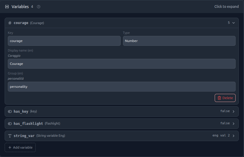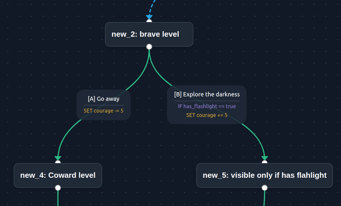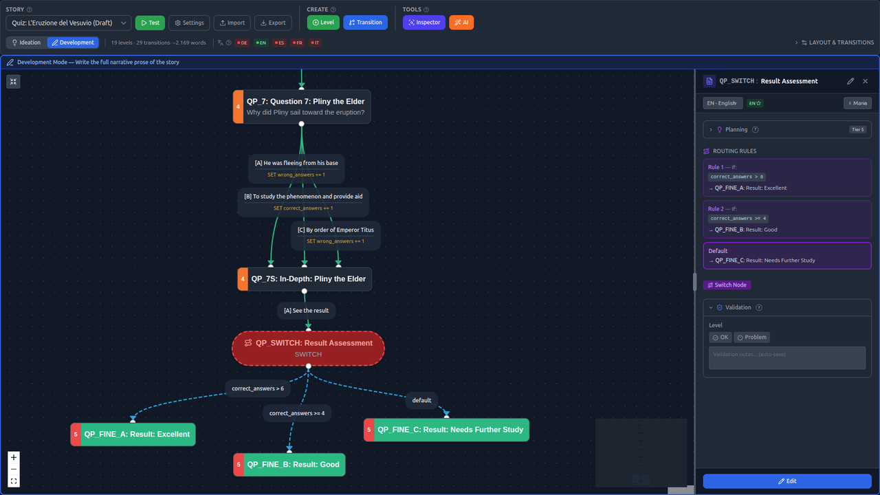 I also added conditional switch nodes that automatically route the player based on variable values without requiring a choice. String variables support translations too, so variable content follows the same multilingual workflow as the rest of the story.