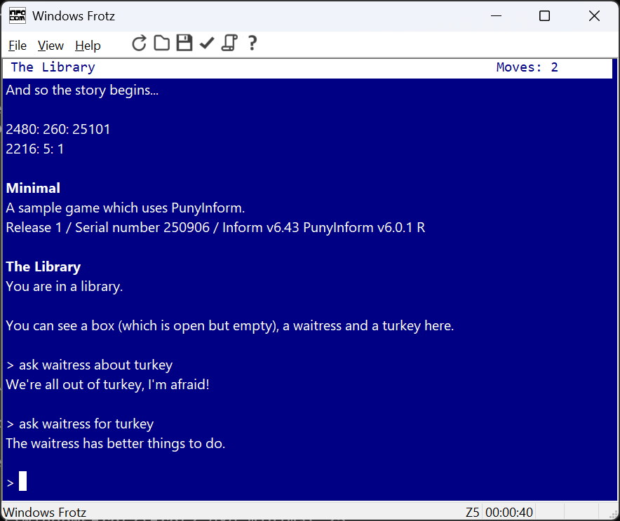 I have to duplicate all the code for Ask and AskFor (there are several “turkeys” in the game…) because they parse the “second noun” differently (Ask is second and AskFor is noun).