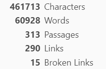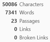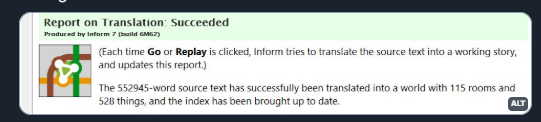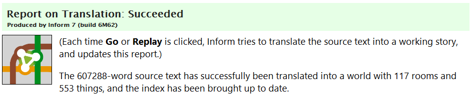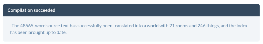 I didn’t realise the Inform compiler provided a word count! I’ve been copy/pasting into a text file partly for the sake of easy backups, and that shows a count of 56,851. The compiler itself gives me 48,565: