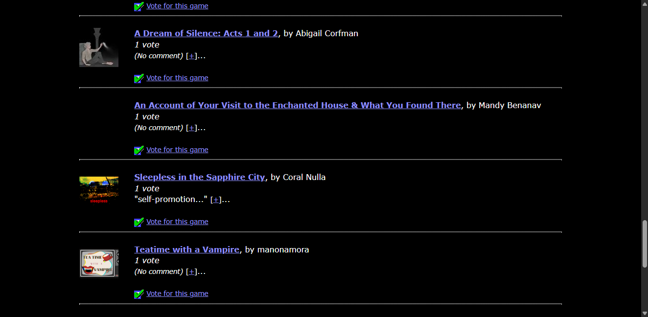 IFDB’s list feature is really useful for recommending stuff (especially since the “suggest similar games” feature seems underused, I’m not sure why, I think it shows a lot of potential), but the layout of the lists themselves is a little confusing for sighted users.