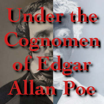 In the background, you can see a portrait of who I assume to be Edgar Allan Poe. However the right half of the image has an inverted palette. Over the top of his face in large, Times New Roman-adjacent red font are the words “Under the Cognomen of Edgar Allan Poe”.