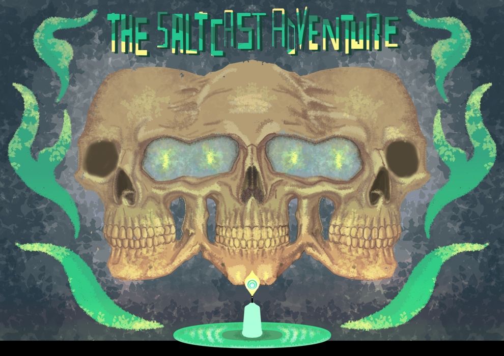 Three skulls joined together by jawbone and temples. The innermost eye of each one (both for the centre eye) is filled with a pearl-coloured substance. Above are thin rectangular assorted lettering that says the title. Below and in front of the skulls in green in a burning candle on a strangle disk. Wisps of stylised green smoke border the image.