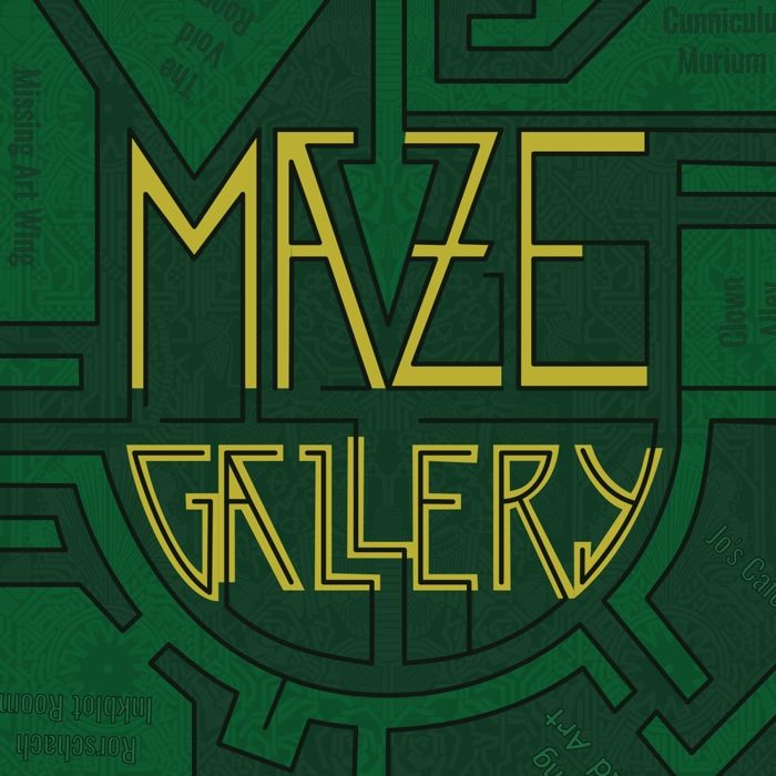 Dark green background with assorted shapes in a slightly lighter shade of green. In the center, in thin straight writing with random lengths for each line and a soft but vibrant yellow shade, are the words “Maze Gallery”. A fairly large arrow, which points downwards to the words but is not easily visible at first since it matches the assorted shapes around the edges. If you look in closer, you will notice light lettering at random angles in each of the shapes, saying things such as “Clown Alley” and “Missing Art Wing”, many of which are half cut off (purposefully).