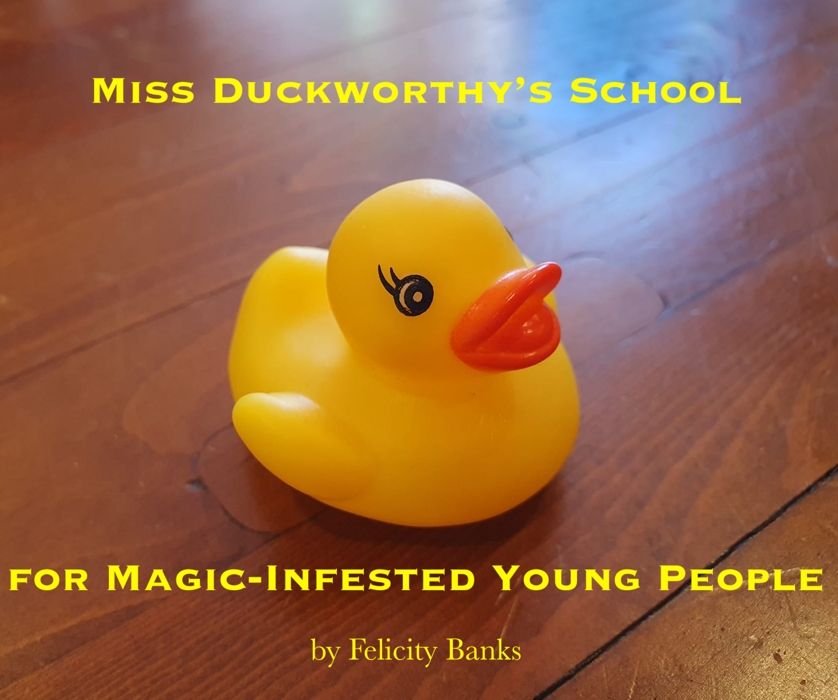 A simple image of a yellow rubber duck on a wooden floor, and the title (plus “by Felicity Banks”) in yellow letters around it.