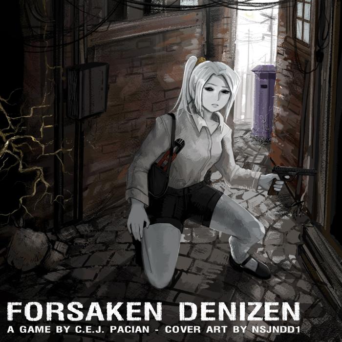A woman kneels, alert, on the floor of a back alley of some unknown street. In her hand, she holds a handgun. The character’s skin is pale, contrasting with the dark brown walls around her. At the bottom, the first line states in all capitals “FORSAKEN DENIZEN”, and the second line reads “A GAME BY C E J PACIAN. COVER ART BY NSJNDD1.”