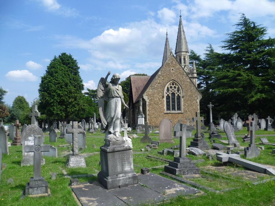 A photograph of a Christian cemetery, where most (but not all) tombstones are crosses. Lush green grass and a dark green forest in the background and a small church or mausoleum or something or other. Near the POV is a tomb with a grave headstone statue depicting an angel with wings looking down solemnly, holding a hand in the air. No text is on the cover art.