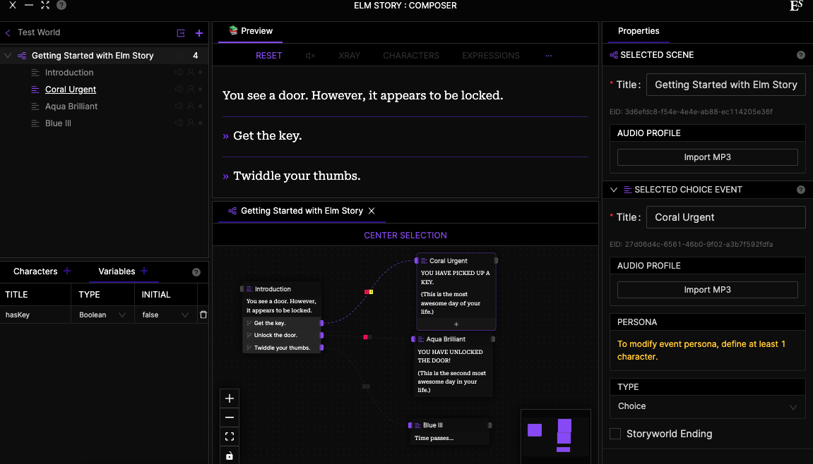 Anything related to Elm Story tool configuration, in the context of your storyworlds, is nested to an editor object. This is used to track things like where a node is positioned or a scene’s zoom level.