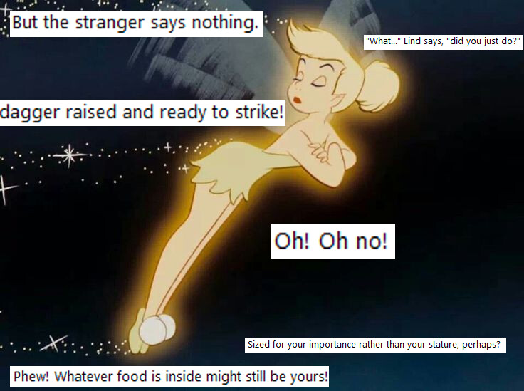 On the challenger’s side of Keyboard Stadium, there are so many ingredients being flung around that the task feels like it hinges on identifying which are keystones are which are ornamental. Is Pacian weaving a fairy tale for us? I’m not convinced – as @AmandaB says, there are rules for such things, and the mere presence of a fairy isn’t determinative (otherwise Tinkerbell, who we’ve seen flitting about the thread, would make Peter Pan a fairy tale, and that can’t be right). With that said, we do seem to have two stock fantasy characters in Trala and Lind, but what jumps out to me from the few bits of description we’re given is how much they foreground relationships – and specifically, frustrated relationships. The fairy wants to be Trala’s Sancho Panza, but she barely notices us at all, while Lind keeps stubbornly avoiding falling head-over-feet for us, whether because of his eyesight or some other defect. Meanwhile, the fairy is literally tied to the stranger, who wears a disguise that works on the others but not on you.