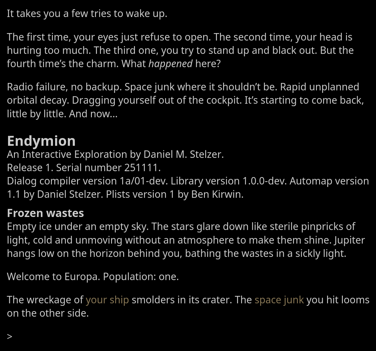 Meanwhile, chez our Iron ChIF, we’ve gotten our first non-mechanical bits in this except from the opening. “Lone survivor of a spaceship crash seeks rescue” is one of the very classic IF plots, of course, but there’s some interesting texture even in these few sentences. For one thing, we’ve got a title – Endymion, who’s the lover of Selene, the moon goddess, in Greek myth; he’s best known for falling into an eternal, deathless sleep, for reasons that vary according to which particular version of the myth you’re reading (“Endymion” is also the name of one of the sequels to the classic sci-fi novel Hyperion, which is a sort of retelling of the Canterbury Tales in space, but I uh never got through the first one, much less the follow-ups, so if that’s one of the intended reference points I’m in the dark!)