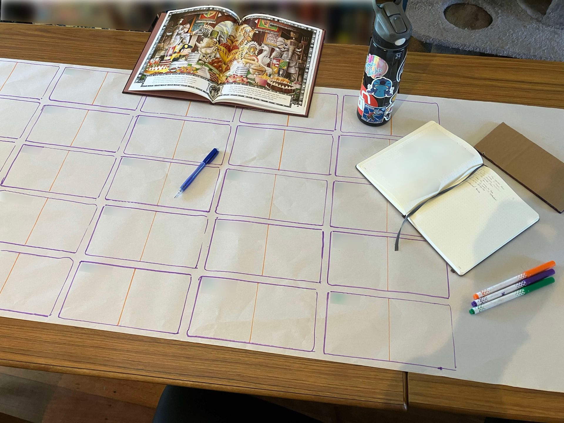 The writing period started early Sunday night for me, but I was still in pre-prewriting mode at that point. On Monday, I cleared off the dining table, cut myself a huge piece of butcher paper, and started drawing up my Big Board. It looked like this: