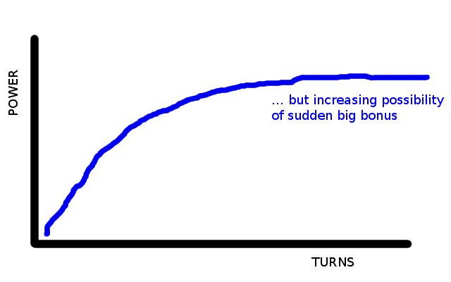 So to be perfectly clear, I think that for this power to be as interesting as possible, the expected “power curve” of the volley would be something like the attached image. It climbs steeply in the beginning, because it should clearly be suboptimal to “volley” as soon as the first thorns appear. But the rate of growth becomes smaller and smaller, so that at some (undefined and contextually determined) point it becomes optimal to use the power rather than wait for a further increase. Except that there is the slight but continually increasing possibility of very powerful rare fruits appearing, which should tempt the player to adopt a “let’s wait one more turn to see if I get the jackpot” stance. But temptations are sometimes best resisted.
