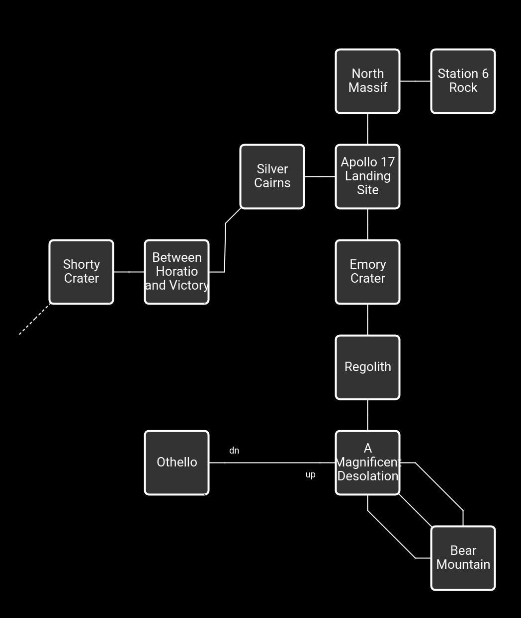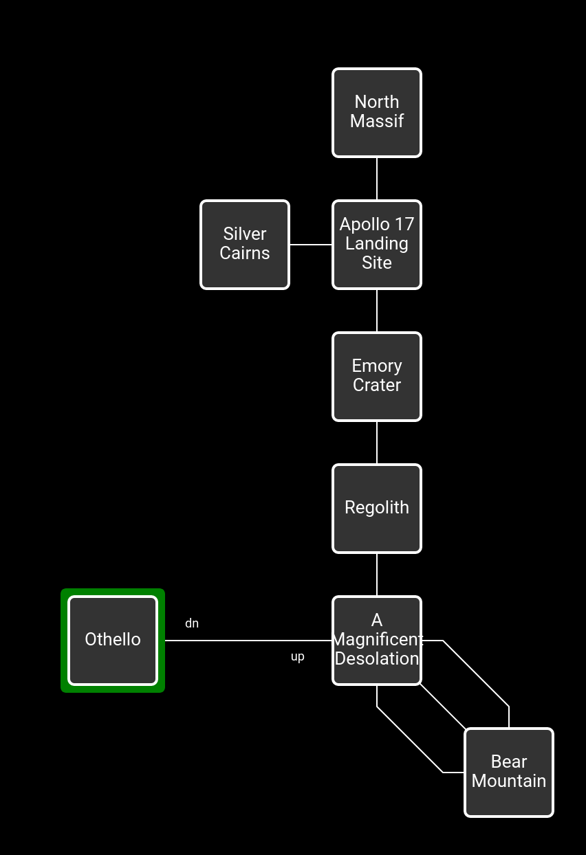 At the moment, we have a lot of truly beautiful scenery and not a lot that we can interact with. I think I’ve found all the exits: any that aren’t marked on this map either take you to Regolith or the Magnificent Desolation, possibly at random. Which means we’re going to have to work with what we’ve got, for now.