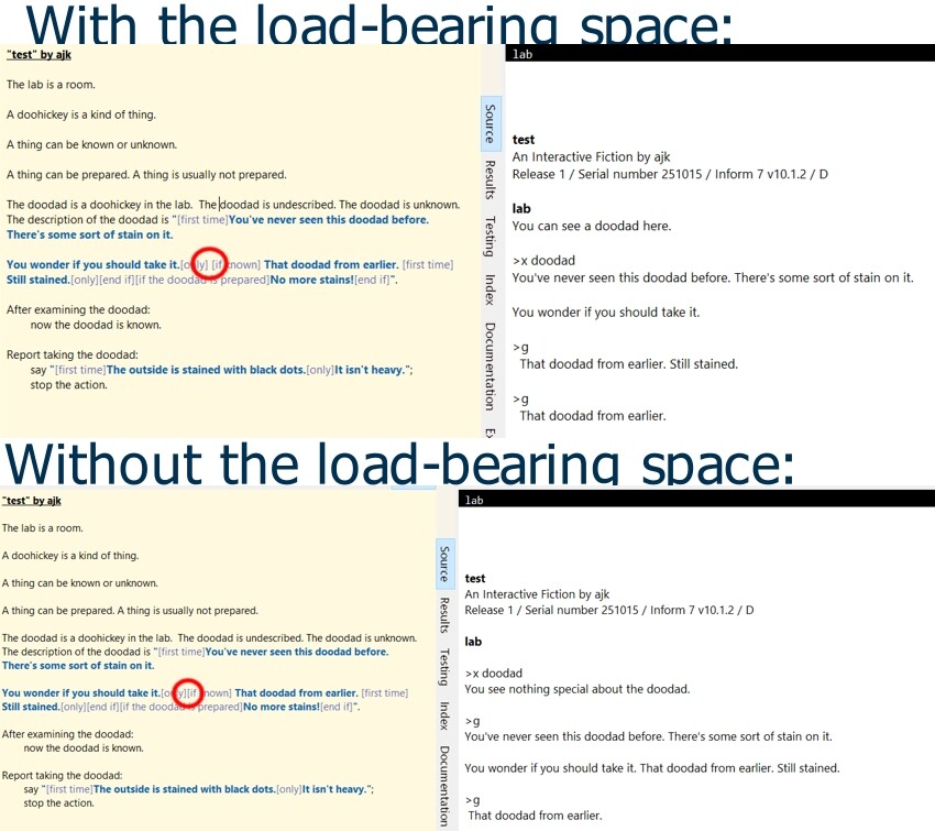 Okay, Inform detectives, a fun new mystery to solve: In a description with a few conditionals there’s a specific set of brackets that, if they have a space in between them, give the correct description but leave an unnecessary space when the object is examined the second time, slightly indenting that second description. Not a huge problem, but something you’d like to polish up before publication.