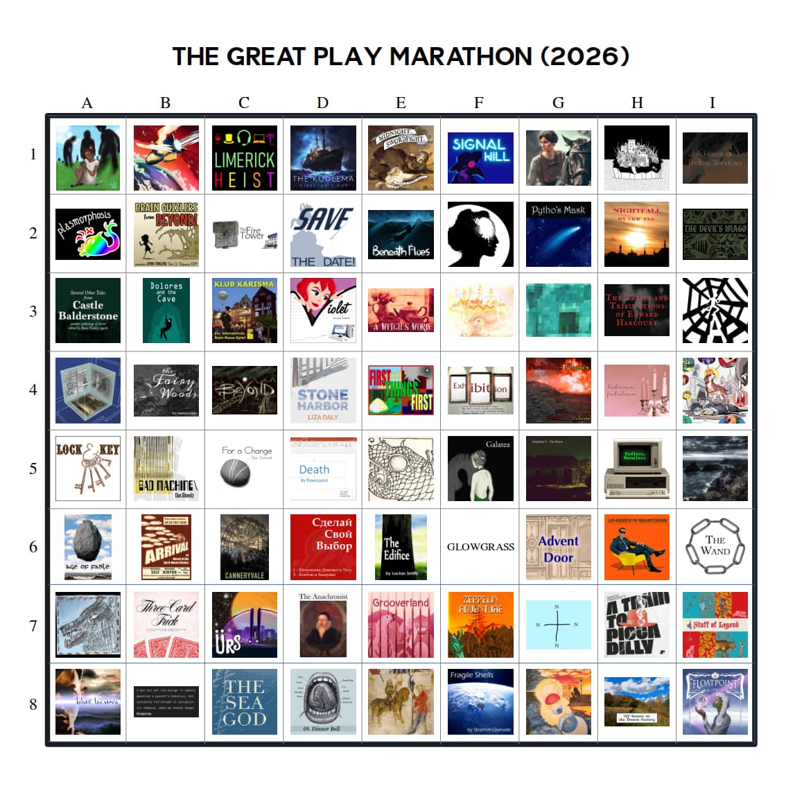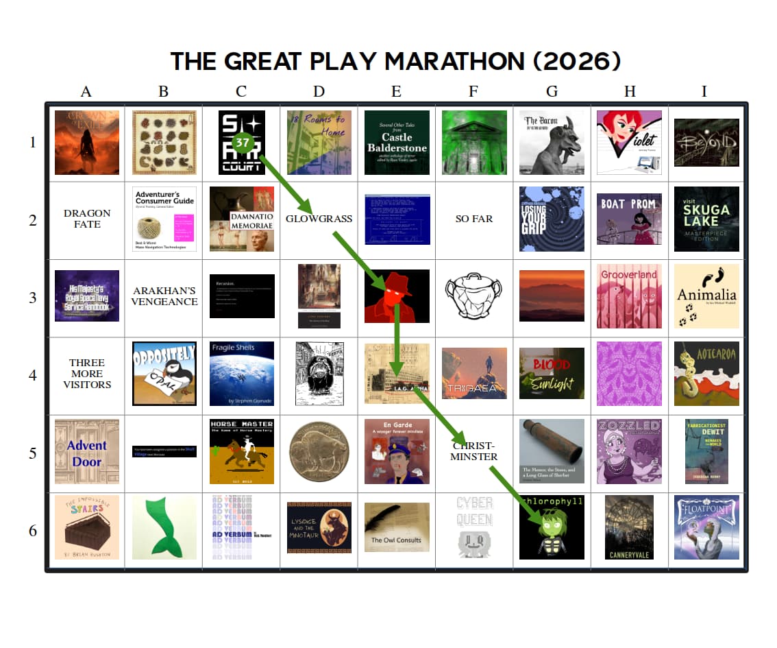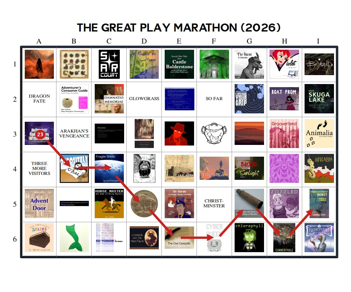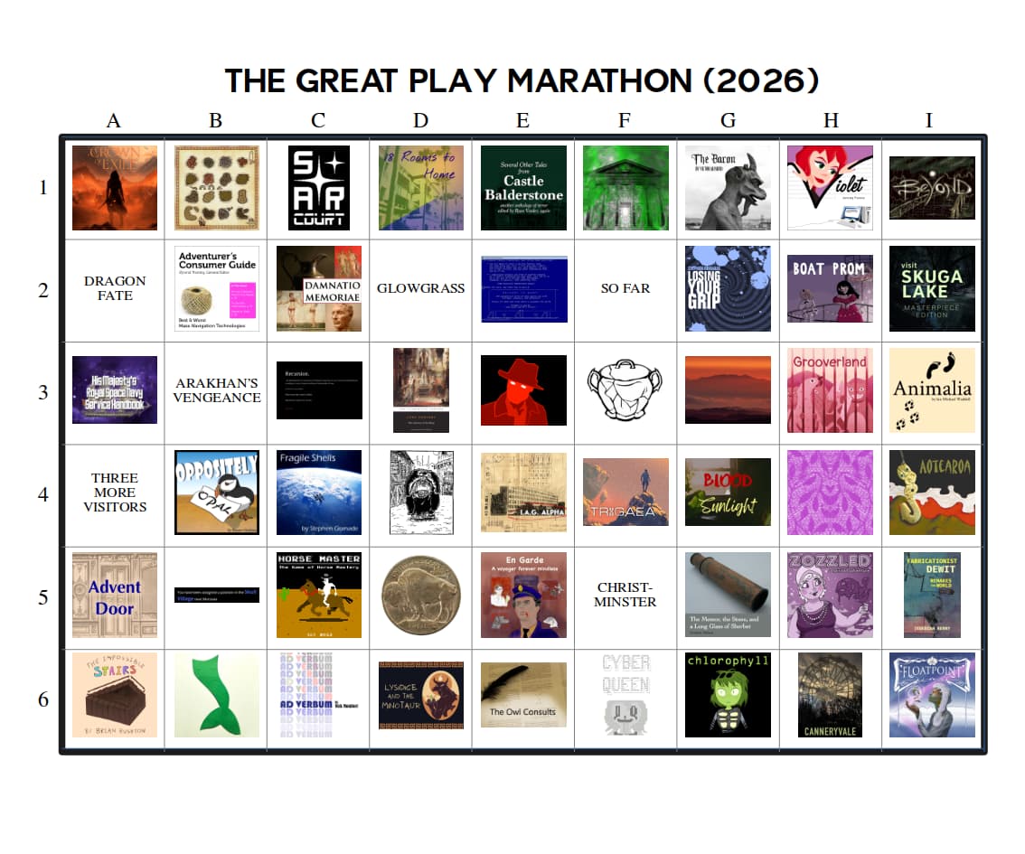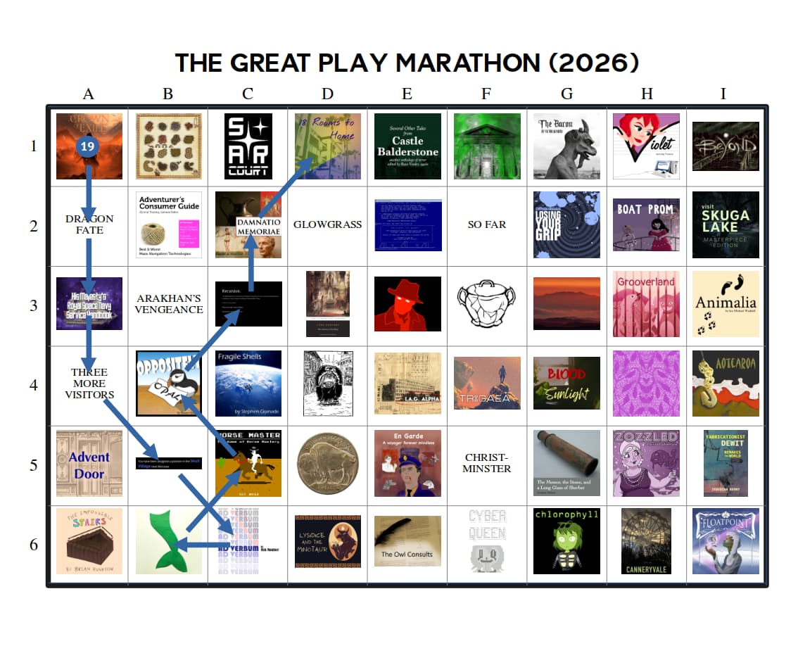 The Great Play Marathon – This would be a “competition” between players instead of games. There would be a selection of perhaps 20 or 30 games (called the “field”) from which each player would play a “course” of 6 to 12 that they choose. This would be a longer event (lasting several months), with people posting their thoughts/impressions/reviews as they go, and various awards for players would be issued at the end, such as fastest course completed, toughest course completed, most useful reviews, etc. Games on the “field” would be selected randomly from among the top 3% rated games on IFDB, which should offer plenty of options for new choices to any one player (mathbrush excepted). Games that were contestants in the Free IF Playoffs or the People’s Champion Tournament would be allowed if they came up during random selection, since part of the reason for these events is to get people to play games that are on their “someday” list.