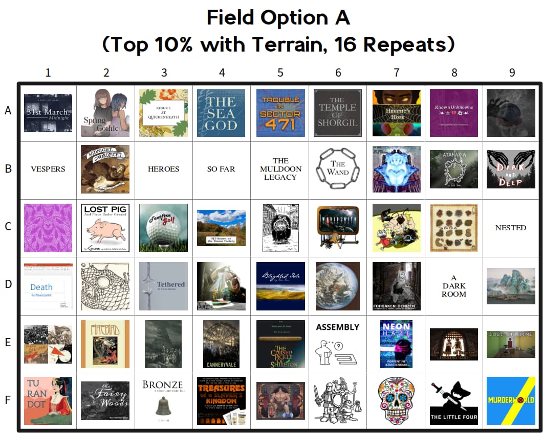 I’ve run some more trials on sample field selection at various top N% levels, and the results are… inconclusive. It seems to me that the best method of choosing a field is to make it democratic. I’ve pulled a sample from each eligibility pool (top 10%, top 12.5% and top 15%), as follows: