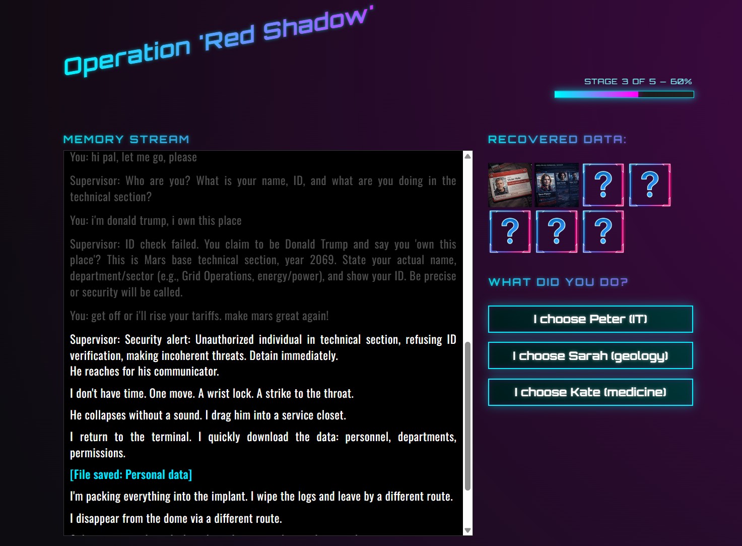 Supervisor and Vale are simpler, but they’re not keyword-based either. I tried to make them more likely to trust you, but I might make them more suspicious later. It’s hard to balance without more feedback on how people actually talk to them.