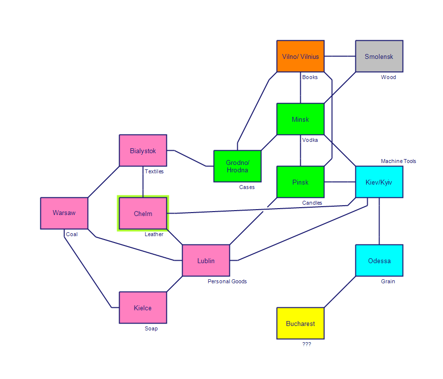 I thought I’d throw in this map for Escape the Pale as I haven’t seen it around yet. It’s not a very big game, but it’s not fully intuitive how the 13 cities are linked together, even if you can roughly locate them on a map. Mechanically, it’s a trading game, with trading routes. I’ll say no more, so we don’t spoil things. But maybe not having to map this game will help people to review or judge one more game …