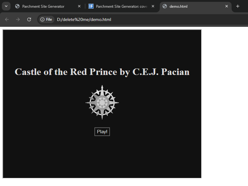 The idea of the play button was so that it wouldn’t autoplay if Parchment is loaded in an iframe. But does Itch use a whole-window iframe? That’s not ideal. I could change it to autoplay if it detects the iframe takes up the whole window.