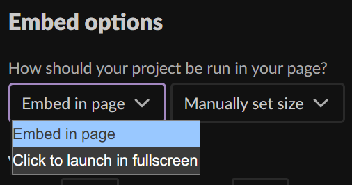If you choose “Embed in page”, you have two additional options. You can have the embedded game start automatically in its small iframe; if this is deactivated, the embed will have a “Play” button as well. You can also add a fullscreen button so the player can turn the iframe into a whole-window iframe at any time.