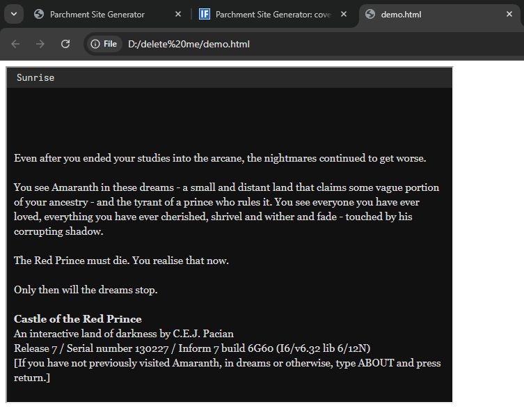 I wouldn’t have thought Itch’s play button would work for solving the sound autoplaying issue because it’s a separate HTML page, but if that’s what other non-IF games use I guess it must. Though I haven’t added sound support to the sitegen tool yet so we couldn’t test it. I’ll try to get to these things soon!