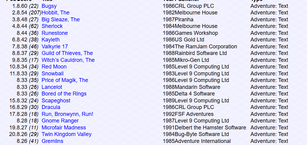 Historically, the trends followed the hardware, which shaped tastes by geography and availability, and also the capabilities of that hardware. In the 8-bit era, different platforms reigned in different areas. The Apple II dominated the USA (and here in Australia) but it was considered too expensive in the UK, which had homegrown cheaper, lower-RAM computers like the ZX series and BBC, and where tapes and not disk drives remained the dominant storage medium for longer. The C64 was the only platform that presented strongly everywhere, and its disk drive was appalling (30 times slower than the Apple’s). So that World of Spectrum list is representative of the UK and European experience, including single-load tape games like Twin Kingdom Valley, and then for more advanced games, the list is big on Level 9. Infocom didn’t release games on the Spectrum.
