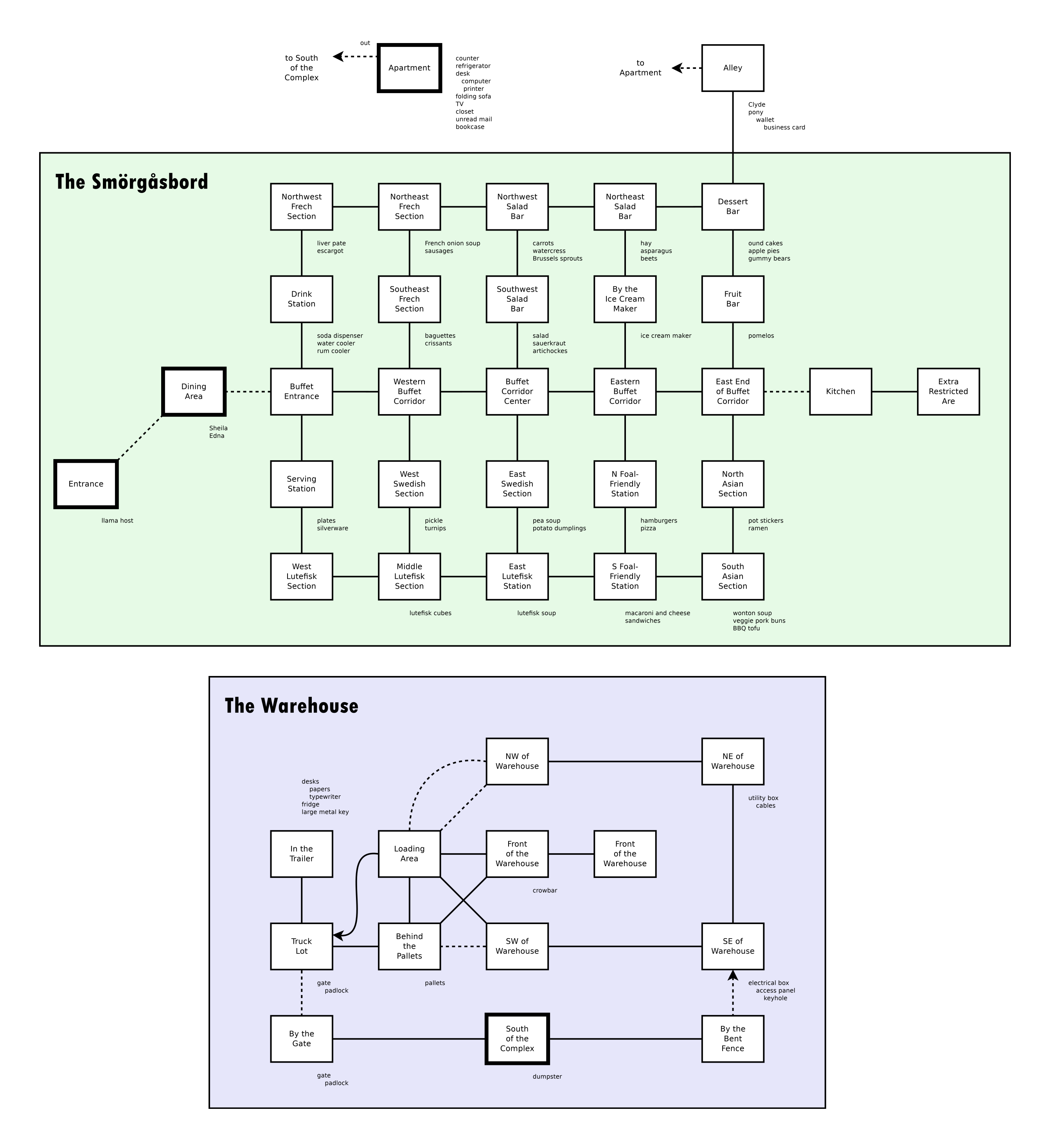 It’s really good to see a map for Smörgåsbord. Though the one provided for the buffet as part of the feelies is truly excellent, I got hopelessly lost at the warehouse and really would have needed something like this to have a solid idea how the various “rooms” fitted together. I think I possibly didn’t have enough of a grasp how much space the warehouse building took up within the fence? If I give the game another go, I’ll definitely be thinking of this map (and might even refer back on it).