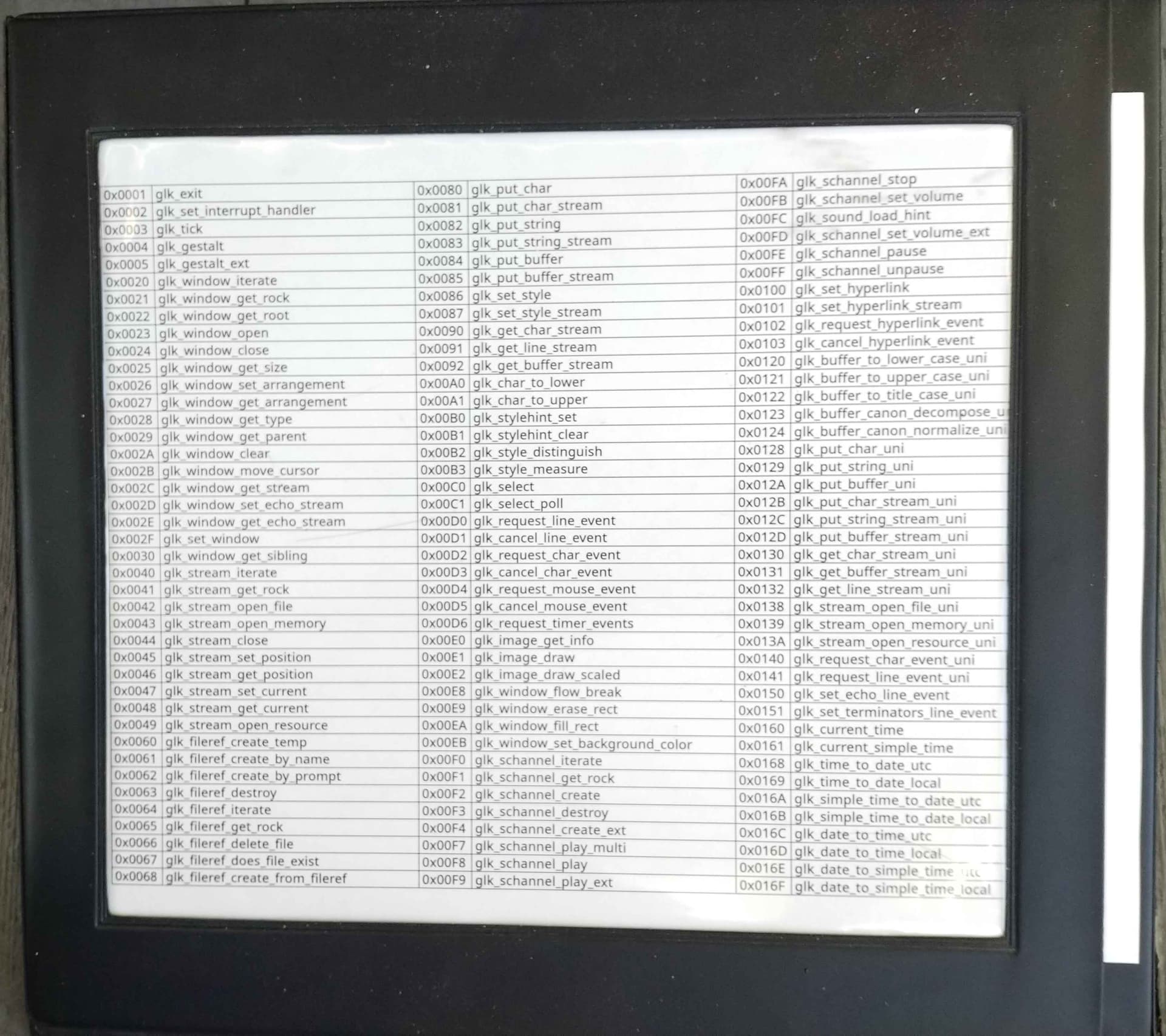 And here’s a landscape one-page PDF of all the Glk opcodes with their hex values. (It’s the final page of the document above but I figured I’d provide it alone, too; it could hold some interest as a reference outside the context of the whole document.)