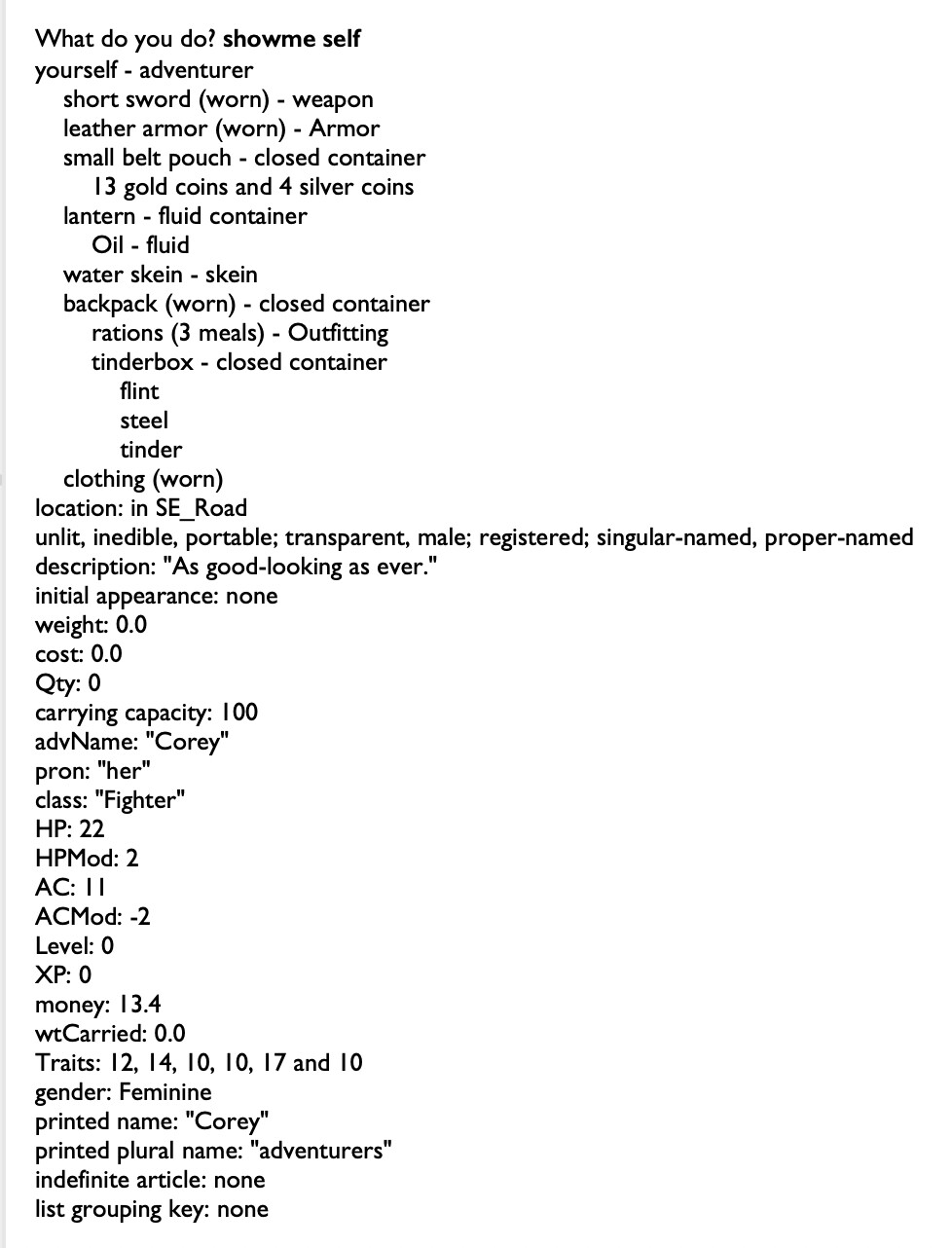 The gender of the player is feminine., which compiles. Then when I create a character, male or female, the SHOWME dump still says “male” in that list of properties (that start with unlit, inedible…) but the gender of the character (near the bottom of the dump) say the appropriate gender, Masculine or Feminine, depending on which I created.