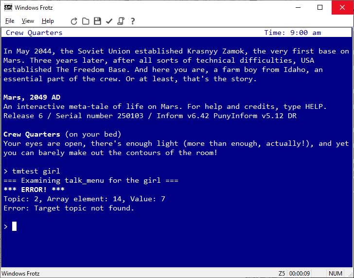 - talk_menu topics are now shown eight at a time even in z3 games.