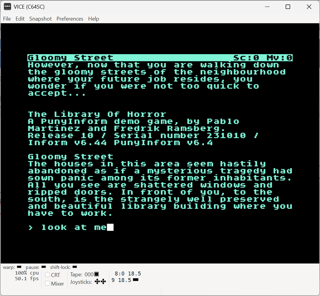 Iāve updated the Inform6Unix package a few times to follow the new releases of PunyInform. The last of these, version 6.44-r3 contains PunyInform version 6.3.1, is up at 661.org and soon at the IF Archive.