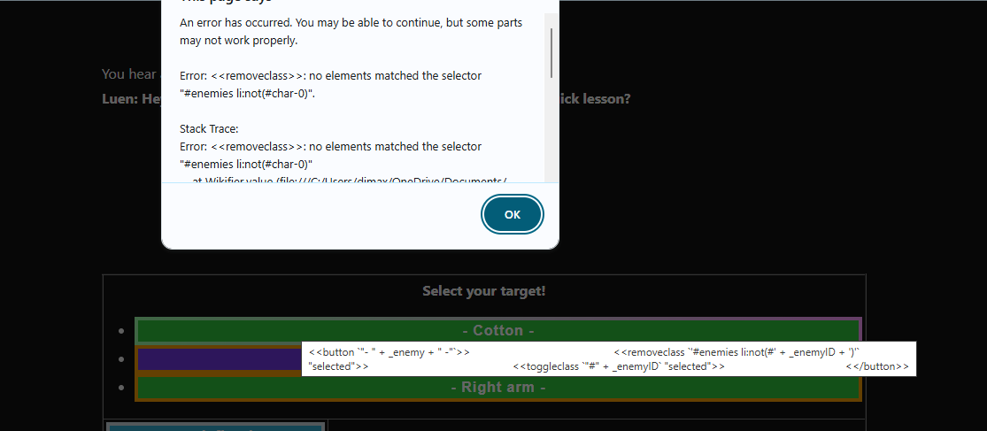 longstory short, i cant figure out how to implement code for my combat system to change the class of my buttons for the sake of making them change color when clicked. I’m having them change classes because i know that CSS has the “:active” thing i can put on the end of it, but i want to allow multiple buttons to be active in different menus so im doing it this way.